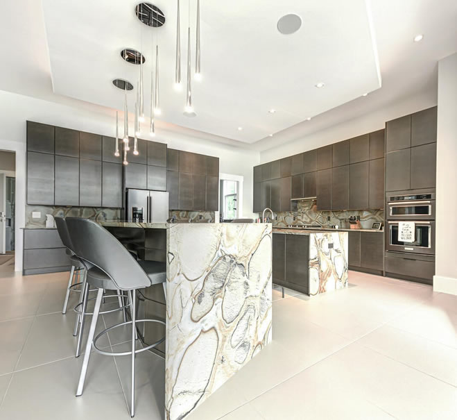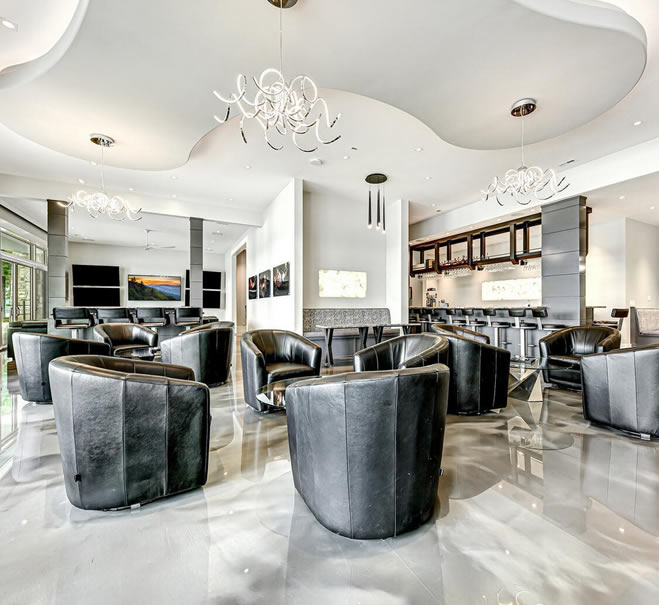 Inside, the home is a showcase of modern elegance and high-tech comfort. The main level features soaring 12-foot ceilings and an open floor plan that flows effortlessly across large-format tile flooring. A modern stairway with glass railings adds architectural flair, while panoramic windows fitted with Lutron automated blinds flood the space with natural light. The home is equipped with 15 large HDTVs, a whole-home audio system, and two central vacuum systems for convenience. The chef’s kitchen is outfitted with high-end KitchenAid appliances and is complemented by a butler’s pantry featuring a Beverage Air refrigerator and freezer, stainless steel counters, and ample storage. A spacious living room with a gas fireplace, three stylish half baths, a dedicated office, a laundry room, and a guest suite with an ensuite bath complete the main level. A full-width lakeside balcony offers a stunning outdoor extension of the living space, perfect for entertaining or relaxing with a view.